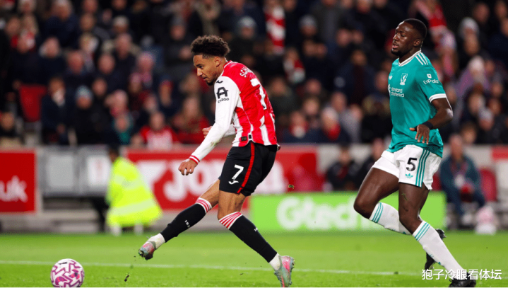 Ở phút 45, đường chuyền phía trước của Liverpool bị chặn lại và hàng thủ không vào đúng vị trí. Damsgaard tung ra một đường chuyền như dao mổ, và Shad ghi bàn chỉ bằng một cú sút.
